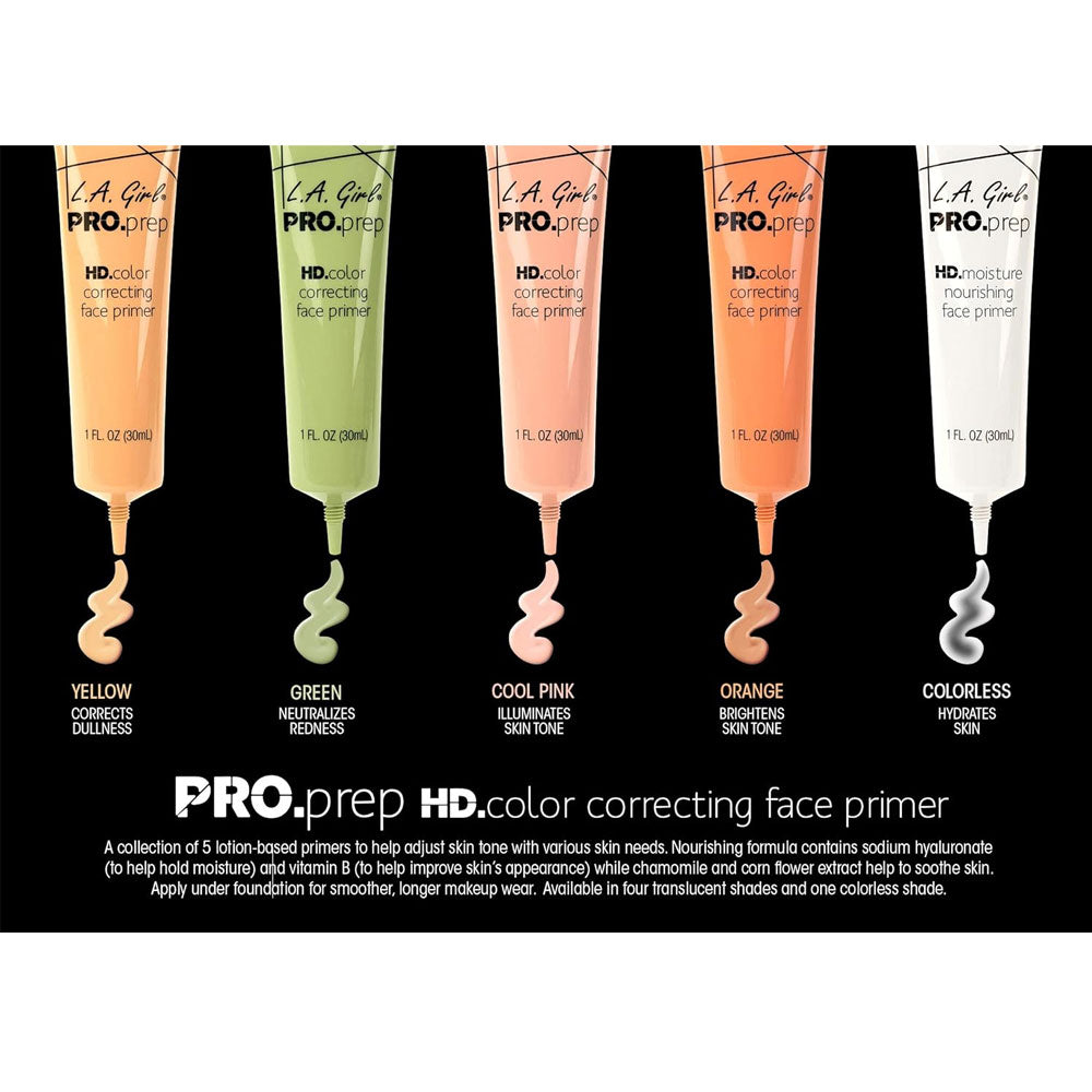 Elevate your makeup routine with LA Girl Pro Prep HD Moisture Nourishing Primer—a clear, hydrating base that softens skin, smooths texture and extends makeup wear for a refreshed, glowing finish.