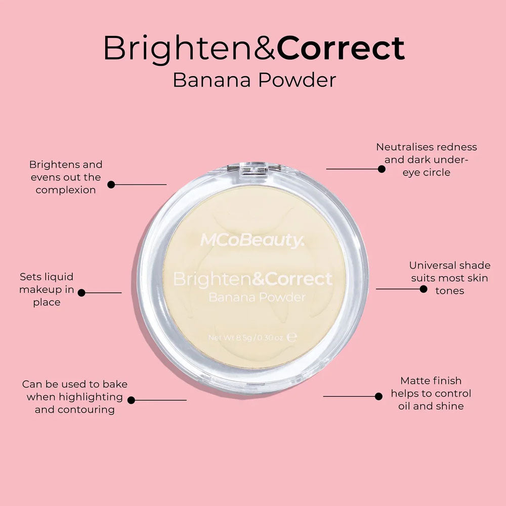 Set, smooth and brighten your complexion with MCoBeauty Brighten & Correct Banana Powder. This silky, finely milled setting powder instantly blurs imperfections, controls shine and enhances your natural radiance with a soft, photo-ready finish.