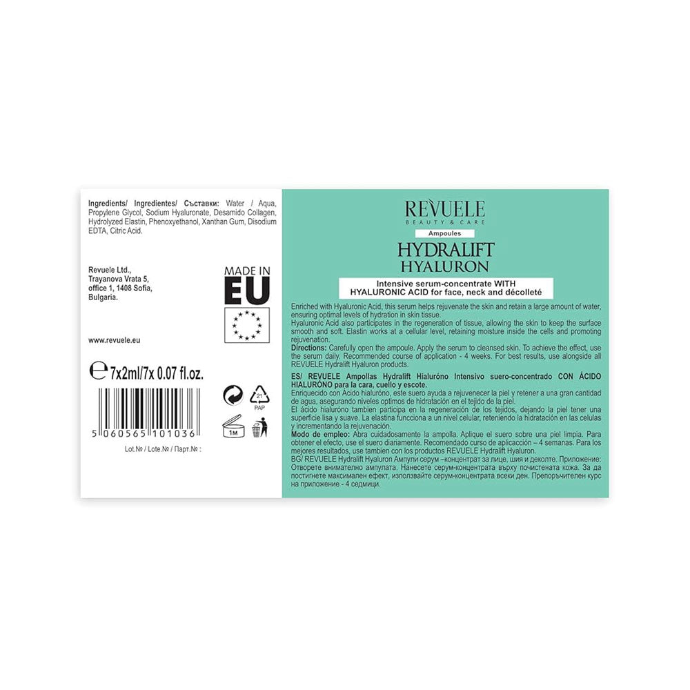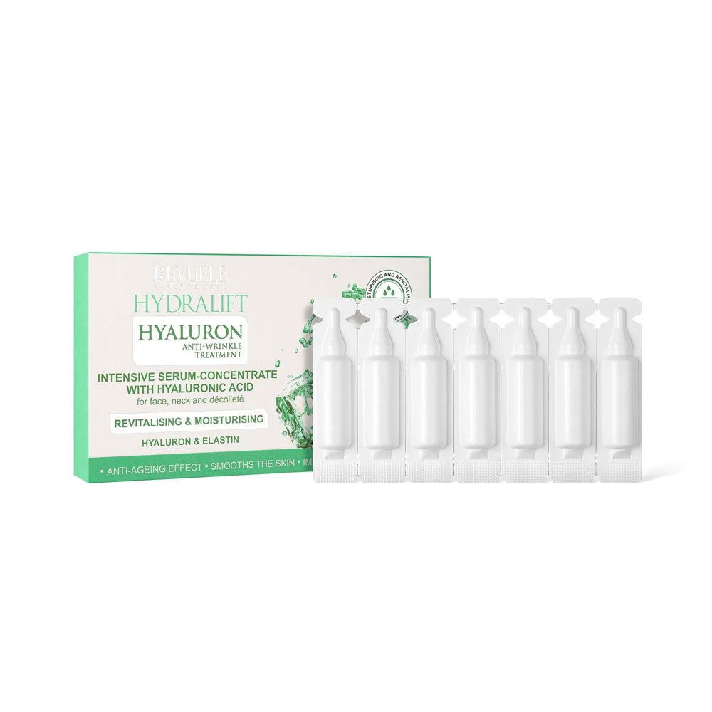 Revuele Ampoules Hydralift Hyaluron Intensive Serum Concentrate with Hyaluronic Acid is a deeply moisturising skincare treatment designed to instantly hydrate, smooth and revitalise the skin. Each ampoule delivers a high concentration of Hyaluronic Acid, Panthenol, and Vitamin E to help lock in moisture, reduce fine lines and restore elasticity for a firmer, more youthful appearance.