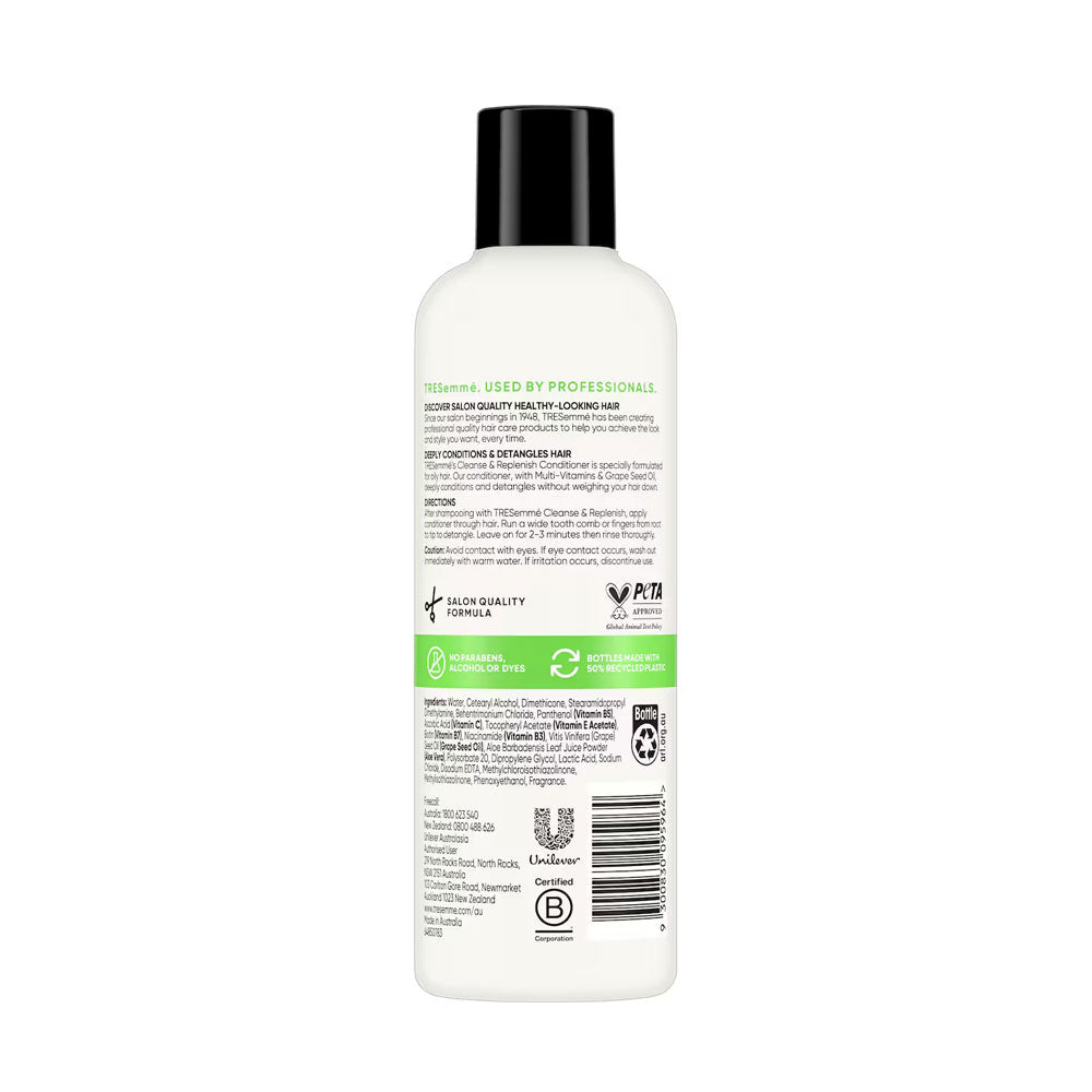 Refresh and restore your hair’s natural vitality with TRESemmé Cleanse & Replenish Conditioner. Infused with a blend of multivitamins and Grape Seed Oil, this lightweight conditioner helps nourish and hydrate while leaving hair feeling clean, soft and balanced.