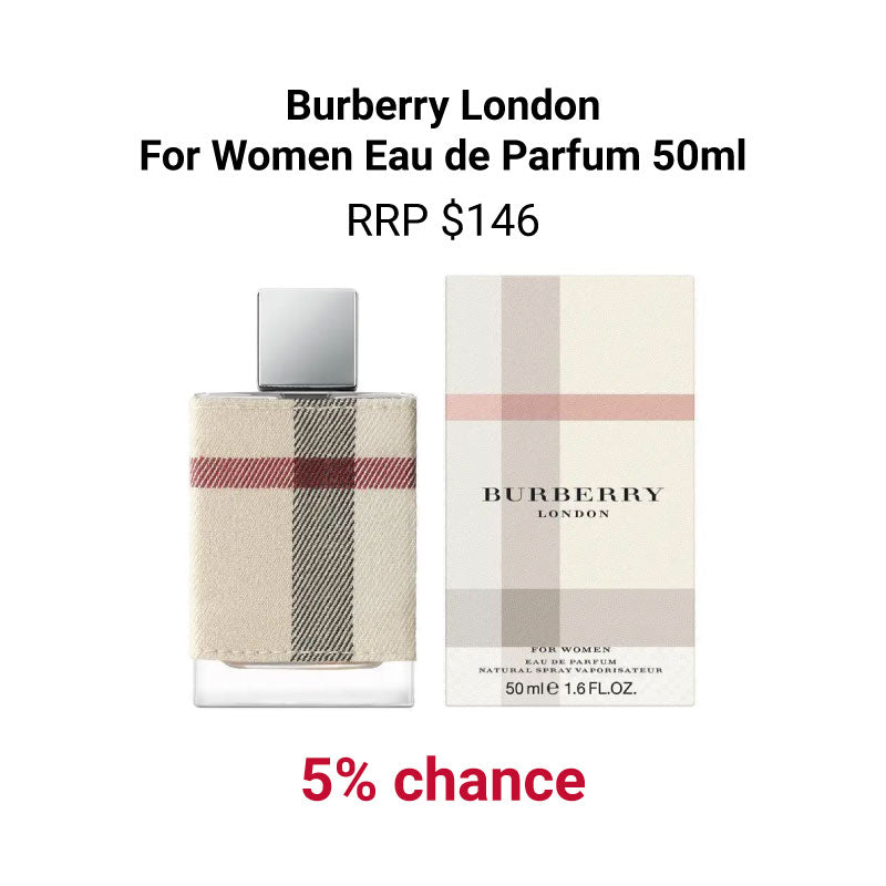 | Burberry London For Women Eau de Parfum 50ml | $146 | 5% chance đŻ |