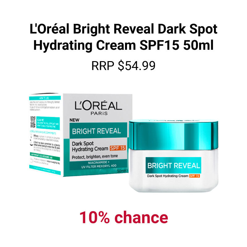 | L'OrĂ©al Bright Reveal Dark Spot Hydrating Cream SPF15 50ml | $54.99 | 10% chance đ§ |