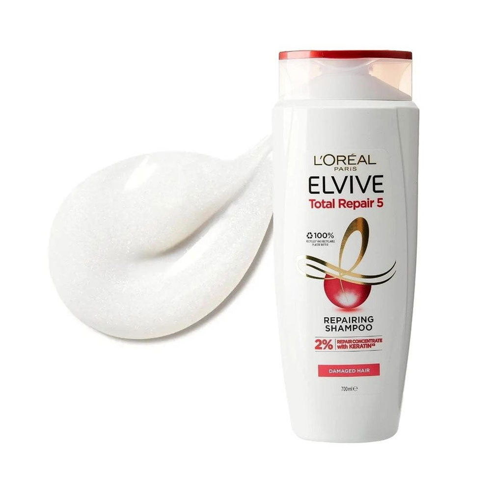 Repair and strengthen damaged hair with L’Oréal Paris Elvive Total Repair 5 Shampoo. Specially formulated to target the five visible signs of hair damage — dryness, weakness, roughness, dullness and split ends — this nourishing shampoo leaves hair soft, smooth and resilient from the first wash.