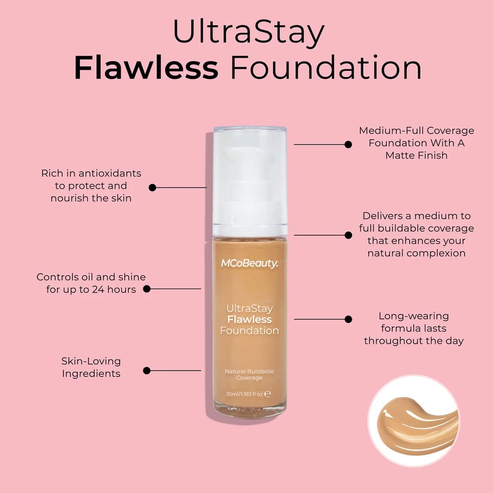 The MCoBeauty ULTRASTAY FLAWLESS FOUNDATION is a full coverage liquid foundation with a natural matte finish that offers buildable coverage that won't cake, fade or rub off. With ingredients like Chamomile and Gingseng Root Extract, skin feels nourished and revitalised.
