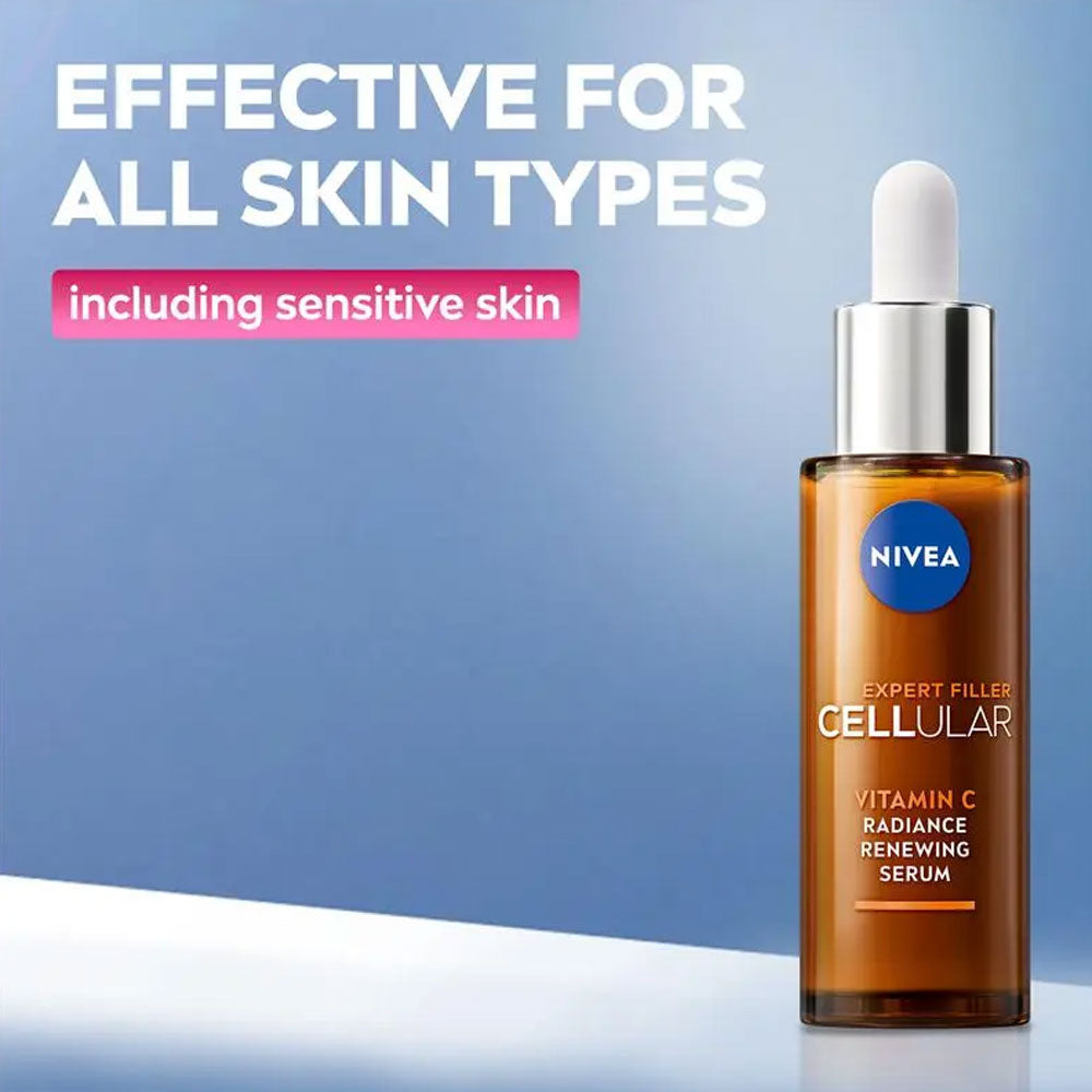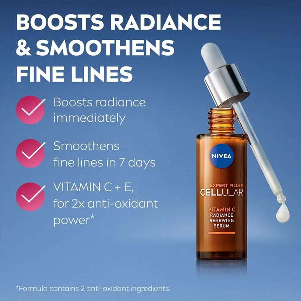 Enhance your skin’s natural luminosity with the NIVEA Vitamin C Radiance Renewing Serum Expert Filler Cellular 30ml — a targeted skincare serum designed to brighten, smooth and hydrate for a more radiant complexion. Infused with stabilised Vitamin C and advanced hydration technology, this lightweight formula works to revitalise dull, tired-looking skin while helping to refine texture and improve overall tone.