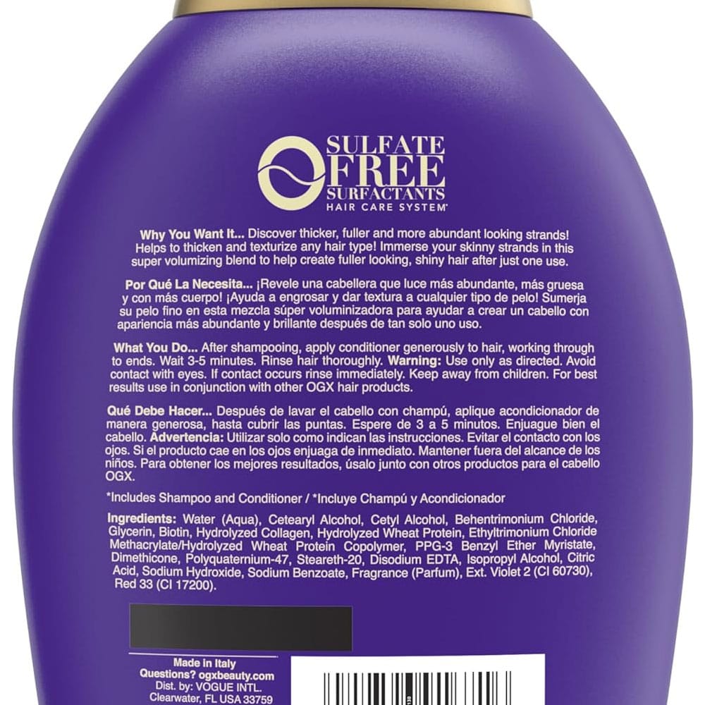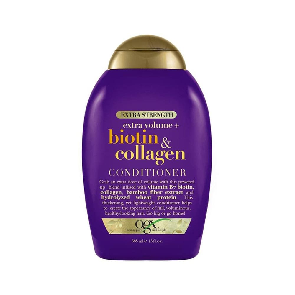 OGX Extra Strength Extra Volume+ Biotin & Collagen Conditioner helps to create the appearance of full, voluminous, healthy-looking hair.