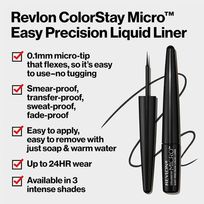 Achieve ultra-precise, bold eye definition with the Revlon ColorStay Micro Liquid Liner in 301 Blackout. Designed with an extra-fine 0.1mm micro-tip, this liquid liner delivers sharp, sleek lines with maximum precision, making it perfect for subtle definition, tightlining, or ultra-thin wings.